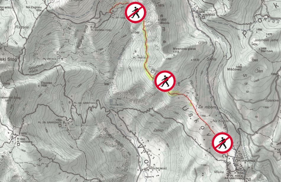 OBVESTILO UPORABNIKOM PLANINSKIH POTI: Uporabnikom planinskih poti priporočamo, da se na spletni strani stanje-poti.pzs.si, v bližnji planinski koči ali pri lokalnem planinskem društvu predhodno informirajo o dejanskem stanju planinskih poti. Če opazite poškodbe planinskih poti ali njihovo neustrezno urejenost (obledele markacije, zaraščenost ipd.), prosimo, da na naslov poskodbe.poti@pzs.si pošljete sporočilo, v katerem navedite, na kateri planinski poti ste opazili pomanjkljivost in pomanjkljivost opišite ter če je možno, dodajte tudi fotografijo.