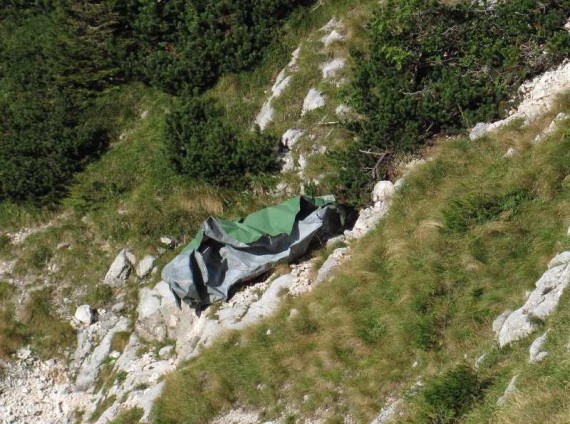 Zdenka Mihelič3 / 8Bivak sta s plastično ponjavo zaščitila Marjan Ručigaj (na sliki) in Milan Čelik, foto: Milan Čelik