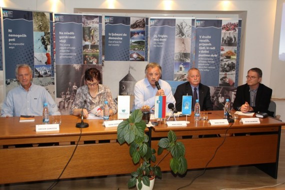 Z leve Gregor Gomišček (predsednik SGK Skala), Irena Vadnjal (Urad Vlade RS za Slovence v zamejstvu in po svetu), moderator Miro Eržen (vodja SPM in podpredsednik PZS), Janez Kavar (predsednik Združenja vojaških gornikov Slovenije), in dr. Peter Skoberne (v. d. direktorja TNP)