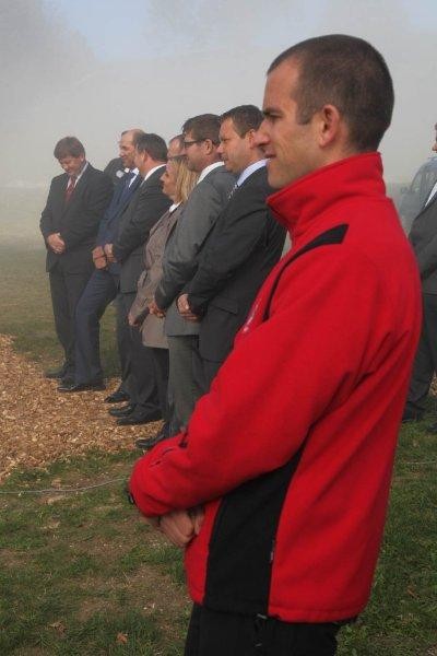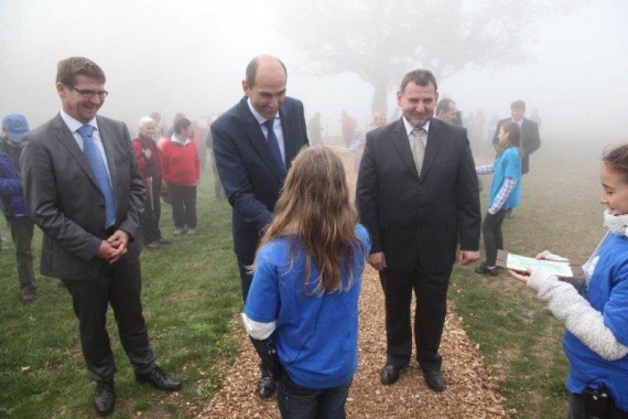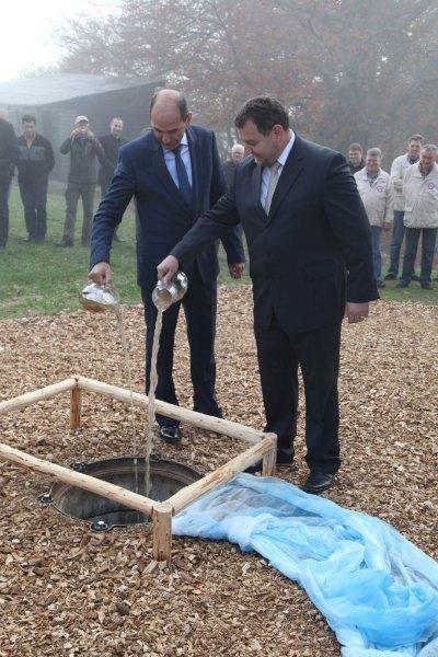 Z zlitjem umazane vode v rastlinsko čistilno napravo so sevniški župan Srečko Ocvirk in predsednik vlade Janez Janša ter …