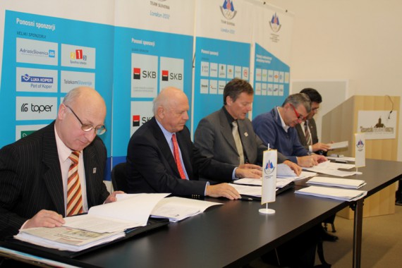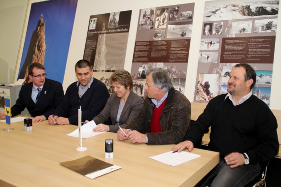 (Z leve) predsednik PZS Bojan Rotovnik, kranjskogorski župan Jure Žerjav, direktorica Gornjesavskega muzeja Jesenice Irena Lačen Benedičič, predsednik Uprave Ustanove Avgusta Delavca Miro Eržen in direktor TNP mag. Martin Šolar pri podpisu aneksa