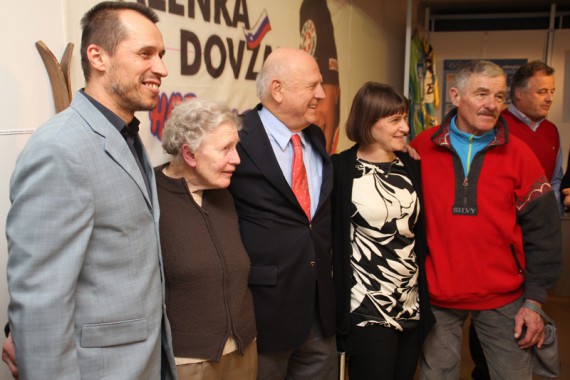 Predsednik OKS dr. Janez Kocijančič z nekaterimi olimpijci od Dovja do Rateč (levo) Robert Kerštajn (smučarski tekač), Mara Rekar (smučarska tekačica), desno ob dr. Kocijančiču Alenka Dovžan (alpska smučarka) in Janez Mlinar (smučarski tekač)