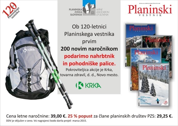 Ob 120-letnici Planinskega vestnika prvim 200 novim naročnikom podarimo nahrbtnik in pohodniške palice. Pokroviteljica akcije je Krka, tovarna zdravil, d. d., Novo mesto.