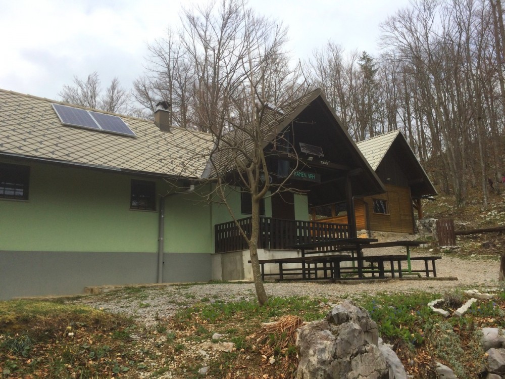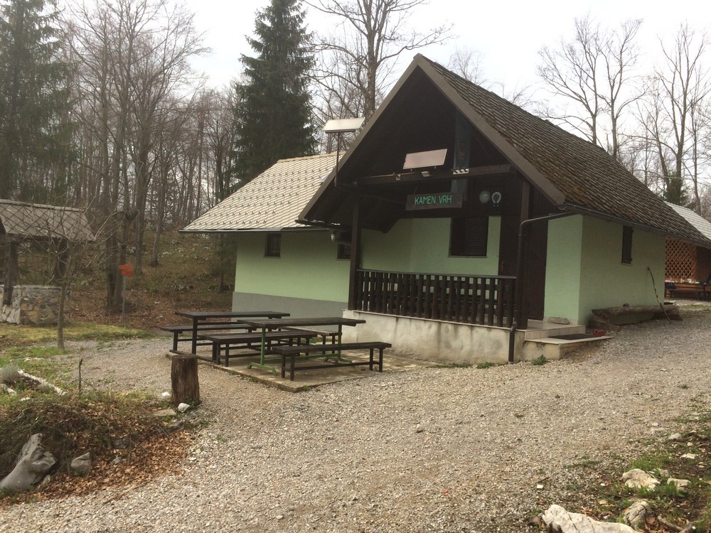 Koča stoji na prisojni strani tik pod Kamnim vrhom (783 m), ki ga domačini imenujejo Kamen vrh. Obdaja jo redek bukov gozd. Kamni vrh je drugi najvišji vrh hribovitega kraškega sveta v severozahodnem podaljšku Male gore med Dobrepoljsko dolino na vzhodu, dolino Rašice na severu in magistralno cesto Velike Lašče-Ortnek na jugozahodni strani. PD Dobrepolje je sprejelo sklep o gradnji koče na ustanovnem občnem zboru 17. decembra 1989. Graditi so začeli leta 1990, kočo pa so popolnoma dokončali in opremili leta 1993. Ob navzočnosti velikega števila krajanov so jo slovesno odprli 22. avgusta 1993. Zgradili so jo s prostovoljnim delom članov PD in ob pomoči krajanov. V naslednjih letih je društvo izvedlo vklop cisterne za vodo, ureditev solarne oskrbe z električno energijo, namestitev črpalke vode ... Zaradi povečanega obiska je zaprti del koče kmalu postal premajhen, zato se je upravni odbor odločil za temeljito povečanje - k obstoječemu objektu so dodali prizidek. Slavnostno odprtje razširjene koče je bilo 14. septembra 2009. Sledila so obširna dela na dokončanju kleti, zapiranju prej odprtega prireditvenega prostora, izvedbi vodnjaka za kapnico in drenaže ob objektu. Uredili so tudi stranišče, pokrito drvarnico in kamin.