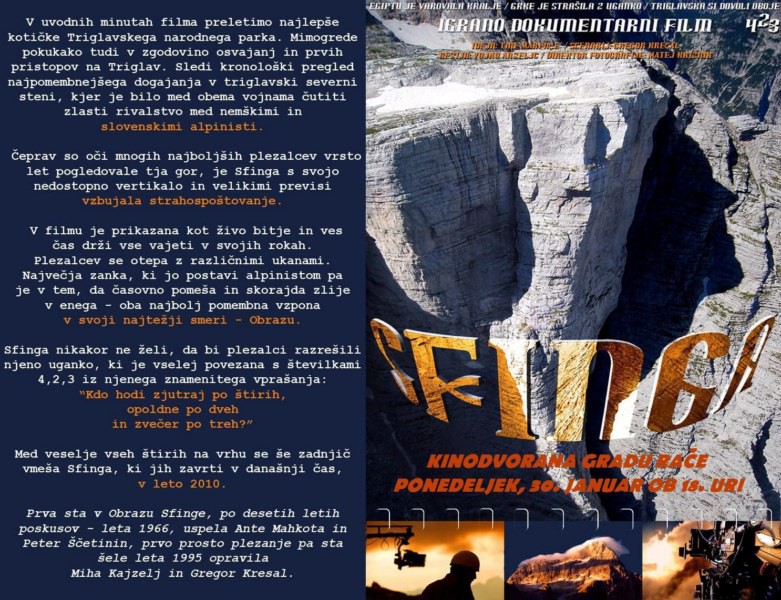 30. 1. 2012, ogledov: 1220Film Sfinga na Gradu Rače | Kdaj | 30. 1. 2012 ob 18. uri | Kje | v kinodvorani na Gradu Rače | Društvo | Planinsko društvo Fram | Vabljeni na projekcijo filma Sfinga tudi v naše kraje!