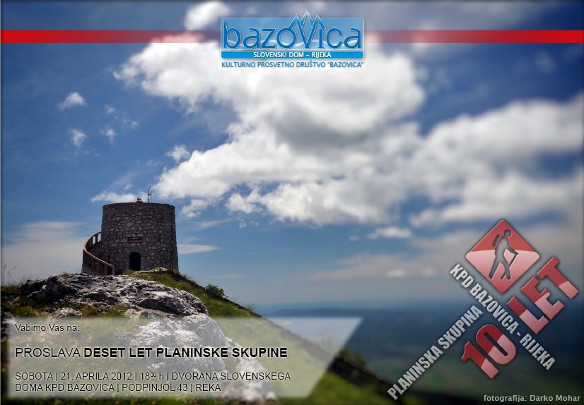 10 let Planinske skupine Slovenskega doma Kulturno prosvetnega društva Bazovica z Reke | Vrsta dogodka | Srečanje | Kdaj | 21. 4. 2012 ob 18. uri | Kje | v dvorani Slovenskega doma na Reki, Podpinjol 43 | Organizator | Slovenski dom Kulturno prosvetnega društva Bazovica z Reke | Planinska skupina Slovenskega doma Kulturno prosvetnega društva Bazovica z Reke vas vabi na slovesnost ob 10-letnici njihovega dela.