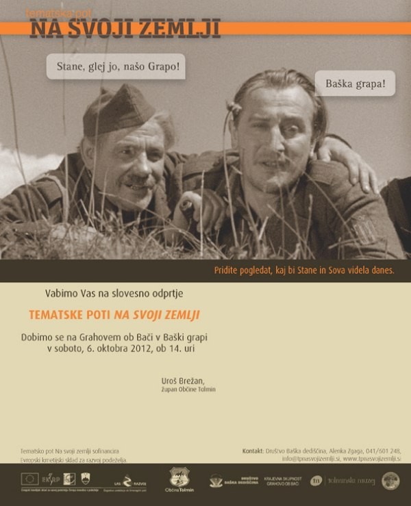 Odprtje tematske poti Na naši zemlji | Vrsta dogodka | Srečanje | Kdaj | 6. 10. 2012 ob 14. uri | Kje | na Grahovem ob Bači v Baški grapi | Organizator | Občina Tolmin | Vljudno vabljeni na odprtje tematske poti.