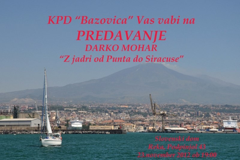 Z jadri od Punta do Siracuse | Vrsta dogodka | Srečanje | Območje | Tujina | Kdaj | 23. 11. 2012 ob 19. uri | Kje | v Slovenskem domu KPD Bazovica na Reki, Podpinjol 43, Reka, Hvaška | Organizator | Planinska skupina KPD Bazovica | Vabljeni na predavanje Z jadri od Punta do Siracuse, s katerim vam bo Darko Mohar poskusil približati lepote južne Italije in vsa prelepa doživetja na 18-dvnevnem potovanju ki se je začelo v Puntu na otoku Krku konec maja letos.