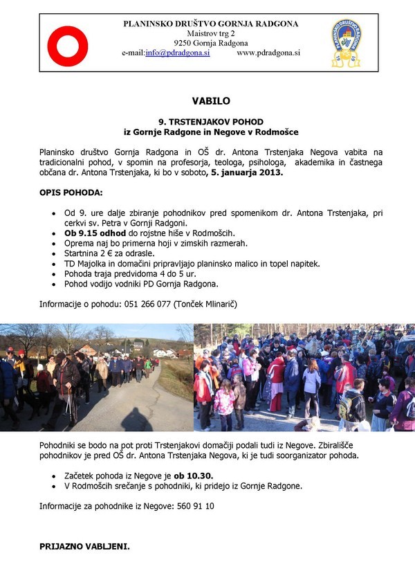 5. 1. 2013 / Pohod, ogledov: 25809. Trstenjakov pohod | Vrsta dogodka | Pohod | Območje | Gričevja in hribovja severovzhodne Slovenije | Kdaj | 5. 1. 2013 ob 9. uri | Kje | v Gornji Radgoni | Društvo | Planinsko društvo Gornja Radgona | Organizator | PD Gornja Radgona | Vodnik / kontakt | Tonček Mlinarič | Prijave | in info: 051 266 077 | Težavnost | Lahka pot | Pot | Zimski pohod | Primernost | Primerno za družine | Trajanje/dolžina | 5-6 ur | Zbirališče pohodnikov je Gornji Radgoni pri cerkvi Sv. Petra.