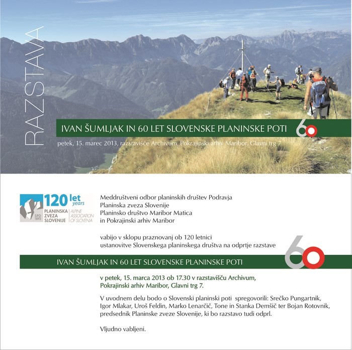 15. 3. 2013, ogledov: 2094Razstava: Ivan ŠUMLJAK in 60 let Slovenske planinske poti | Kdaj | 15. 3. 2013 ob 17.30 | Kje | v razstavišču Archivum, Pokrajinski arhiv Maribor, Glavni trg 7, Maribor. | Organizator | PD Maribor Matica in MDO PD Podravja, PZS in Pokrajinski arhiv Maribor | Informacije | Ivan Kosi, 031 685 400, Slavica Tovšak, 031 414 771 |