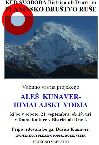 Aleš Kunaver - himalajski vodja, predavanje | Vrsta dogodka | Srečanje | Kdaj | 21. 9. 2013 ob 19. uri | Kje | v Domu kulture v Bistrici ob Dravi | Društvo | Planinsko društvo Ruše | Organizator | KUD SVOBODA Bistrica ob Dravi in Planinsko društvo Ruše | Vabimo vas na projekcijo Aleš Kunaver - himalajski vodja,