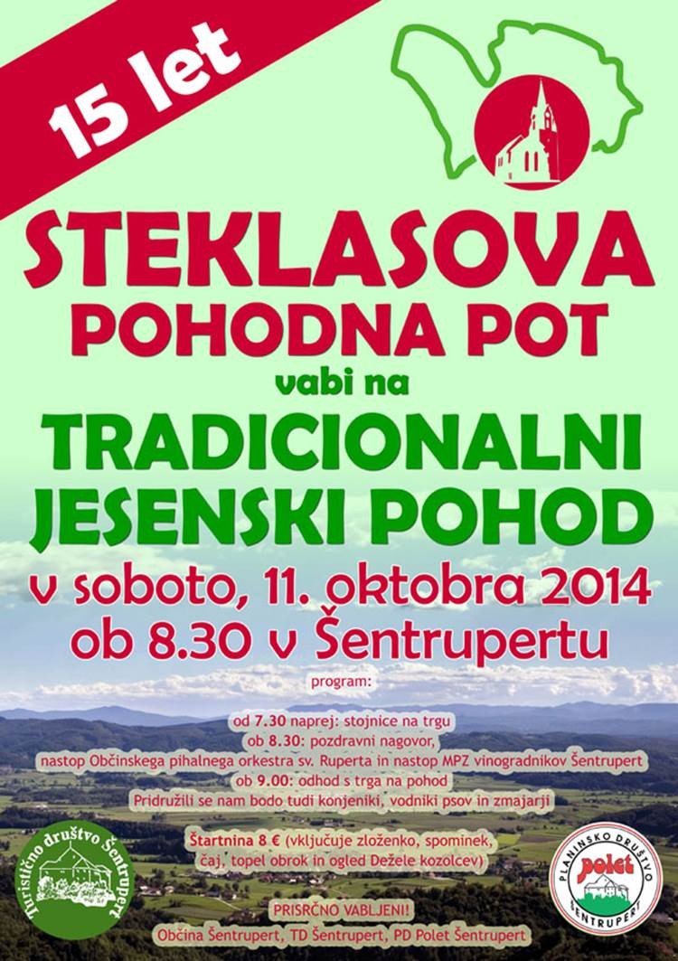 11. 10. 2014 / Pohod, ogledov: 3861Tradicionalni pohod po Steklasovi pohodni poti | Vrsta dogodka | Pohod | Območje | Dolenjska in Bela krajina | Kdaj | 11. 10. 2014 8.30 | Kje | Šentrupert | Društvo | Planinsko društvo Polet Šentrupert | Organizator | PLANINSKO DRUŠTVO POLET ŠENTRUPERT - soorganizator | Vodnik / kontakt | Bojan Brezovar | Prijave | Bojan Brezovar | Informacije | Bojan Brezovar, tel.: 041-541-077 | Težavnost | lahka | Pot | Označena pot | Primernost | za vse starostne kategorije pohodnikov Primerno za družine | Višinska razlika | 320 m | Trajanje/dolžina | 6 ur | Način prevoza | lasten prevoz do Šentruperta | Cena | 8 EUR | Oprema / dokumenti | pohona | Steklasova pohodna pot se vije po obronkih občine Šentrupert. Start in cij pohodne poti je na trgu pred cerkvijo v Šentrupertu, ki je tudi najnižja točka - 280 metrov nad morjem. Najvišja točka poti pa je v Nebesih - 602 metra nad morjem. Pot je označena s Knafeljčevo markacijo in je dolga 20 km. Več kot polovica poti je speljane po poljih, travnikih in markiranih gozdnih poteh. |