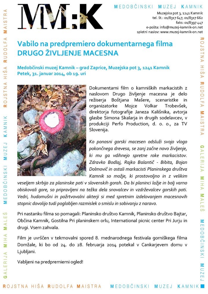 Film Drugo življenje macesna - predpremiera v Kamniku  | Vrsta dogodka | Srečanje | Kdaj | 31. 1. 2014 ob 19. uri | Organizator | Medobčinski muzej Kamnik |