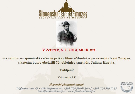 Film Montaž - po severni strani Zmaja v SPM | Vrsta dogodka | Srečanje | Kdaj | 6. 2. 2014 ob 18. uri | Kje | v Mojstrani, Slovenski planinski muzej | Organizator | Slovenski planinski muzej | Cena | Vstopnina 2 EUR. | Več na spletnem mestu PZS >>>. |