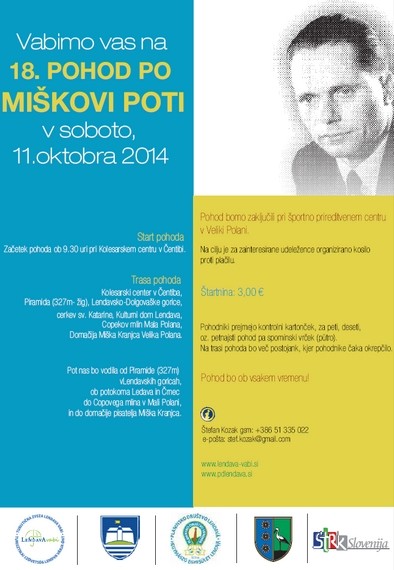 11. 10. 2014 / Pohod, ogledov: 187118. pohod po Miškovi poti | Vrsta dogodka | Pohod | Območje | Gričevja in hribovja severovzhodne Slovenije | Kdaj | 11. 10. 2014 9:30 pri kolesarskem centru v Čentibi | Traja do | 16. 9. 2014 (-24 dni) | Kje | Čentiba - Velika Polana | Društvo | Planinsko društvo Lendava | Organizator | Turistična zveza Lendava vabi | Vodnik / kontakt | Štefan Kozak | Informacije | Štefan Kozak, stef.kozak@gmail.com, (051 335 022), Stanko Žalig (040 296 578), Milan Krampač (031 727 868), ŠTRK Slovenija (041 528 678). | Povezava | http://www.pdlendava.si/index.php?id=18 | Težavnost | lahka pot | Pot | Označena pot | Primernost | Za vse kategorije pohodnikov Primerno za družine | Višinska razlika | 270 m | Trajanje/dolžina | 4 do 5 ur | Cena | 3 €, štartnina | Oprema / dokumenti | Trasa pohoda: Čentiba - Lendavsko-Dolgovaške gorice - Lendava - ob Črncu in Ledavi mimo Copekovega mlina do Male Polane - Velika Polana.