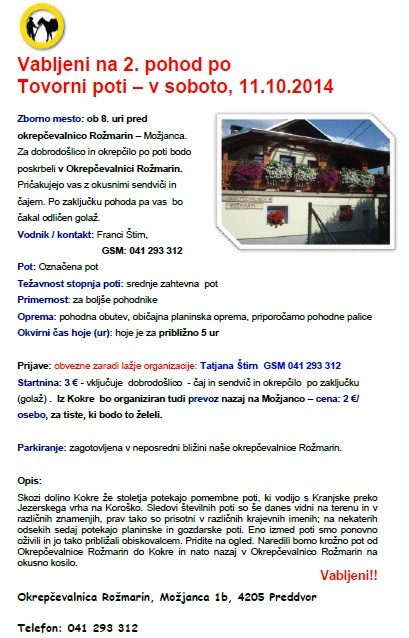 11. 10. 2014 / Pohod, ogledov: 17682. pohod po Tovorni poti | Vrsta dogodka | Pohod | Območje | Kamniško-Savinjske Alpe | Kdaj | 11. 10. 2014 ob 8:00 uri pred okrepčevalnico Rožmarin – Možjanca | Vodnik / kontakt | Franci Štirn | Prijave | obvezne zaradi lažje organizacije: Tatjana Štirn GSM 041 293 312 | Pot | Označena pot | Primernost | za boljše pohodnike | Trajanje/dolžina | 5 h | Cena | 3 € - vključuje dobrodošlico - čaj in sendvič in okrepčilo po zaključku (golaž) . | Oprema / dokumenti | Pohodna obutev, običajna planinska oprema, priporočamo pohodne palice. | Skozi dolino Kokre že stoletja potekajo pomembne poti, ki vodijo s Kranjske preko Jezerskega vrha na Koroško. Sledovi številnih poti so še danes vidni na terenu in v različnih znamenjih, prav tako so prisotni v različnih krajevnih imenih; na nekaterih odsekih sedaj potekajo planinske in gozdarske poti. Eno izmed poti smo ponovno oživili in jo tako približali obiskovalcem. Pridite na ogled. Naredili bomo krožno pot od Okrepčevalnice Rožmarin do Kokre in nato nazaj v Okrepčevalnico Rožmarin na okusno kosilo.