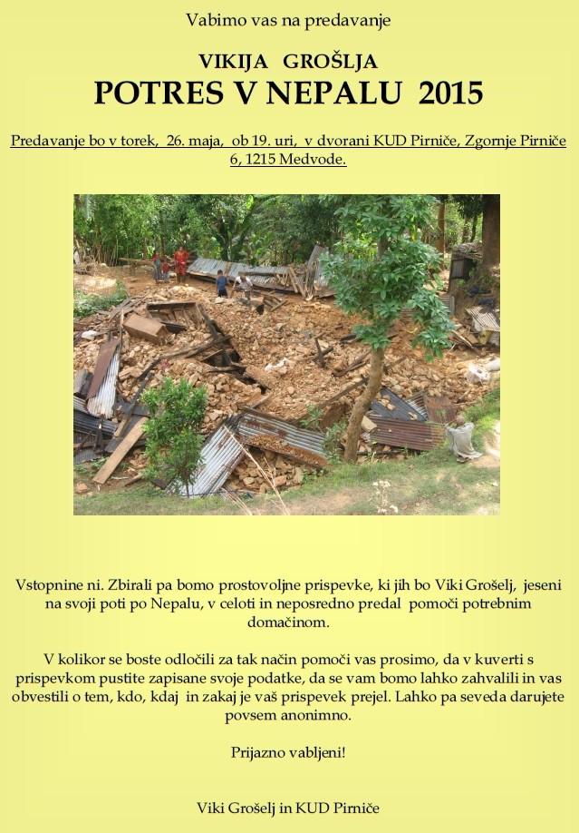 26. 5. 2015, ogledov: 1327Potres v Nepalu - predavanje Vikija Grošlja | Kdaj | 26. 5. 2015 19:00, dvorana KUD Pirniče | Kje | Zgornje Pirniče | Organizator | Viki Grošelj in KUD Pirniče |