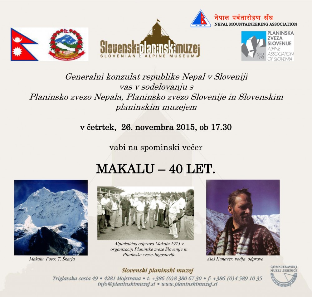 Makalu – 40 let, spominski večer | Vrsta dogodka | Kulturna prireditev | Kdaj | 26. 11. 2015 17:30 | Kje | Slovenski planinski muzej, Mojstrana | Organizator | Generalni konzulat republike Nepal v Sloveniji | Povezava | http://www.pzs.si/novice.php?pid=10594 | Letos mineva 40 let od prvega slovenskega vzpona na osemtisočak –