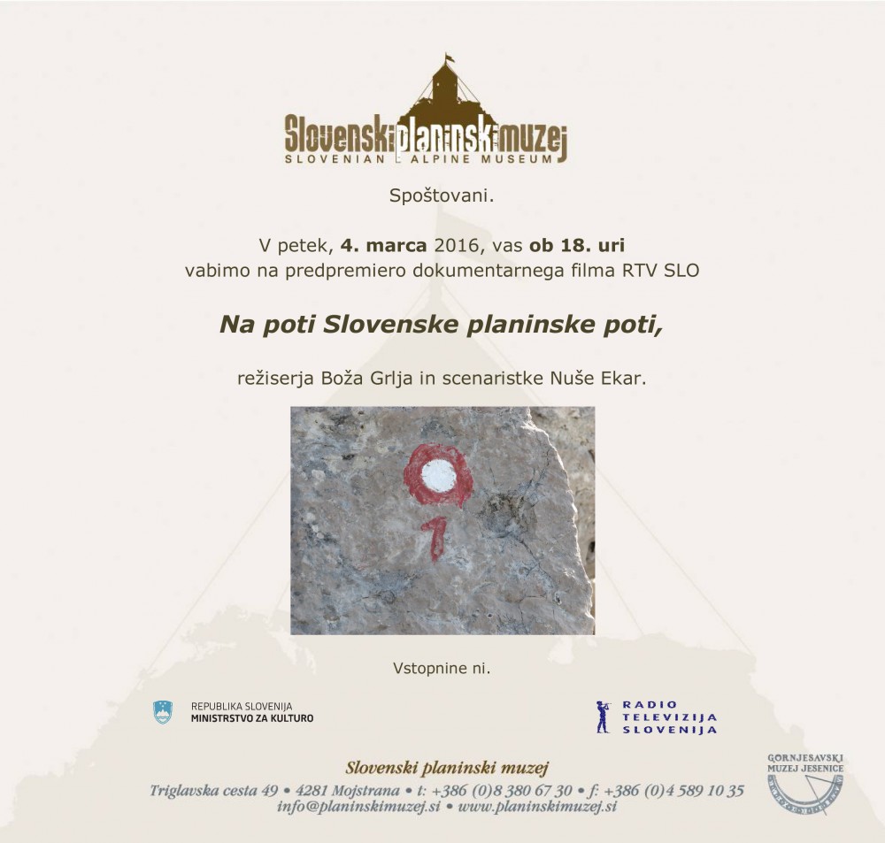 Predpremiera filma Na poti Slovenske planinske poti | Vrsta dogodka | Predavanje | Kdaj | 4. 3. 2016 18:00, Slovenski planinski muzej | Kje | Mojstrana | Leta 1950 se je mariborskemu profesorju in velikemu planincu ter markacistu Ivanu Šumljaku utrnila zamisel o prvi vezni poti, ki bi povezala visokogorski svet s sredogorskim in nižinskim. Tri leta pozneje je njegova ideja zaživela tudi s strani slovenske Planinska zveze in nastala je Slovenska planinska pot - prva takšna transverzala v Sloveniji in Evropi. Leta 1956 so jo razširili in dobila je današnjo podobo. Slovenska planinska pot se prične na SV Slovenije - v Mariboru in konča na JZ države, v obmorskem Ankaranu. Celotna pot je dolga 599 kilometrov in ima 75 kontrolnih točk. Pot predstavlja različne izzive mnogim posameznikom, mi pa smo sledili enemu naših najboljših gorskih tekačev - Klemenu Trilerju, ki jo je pretekel v samo 7 dneh 11 urah in 25 minutah. |