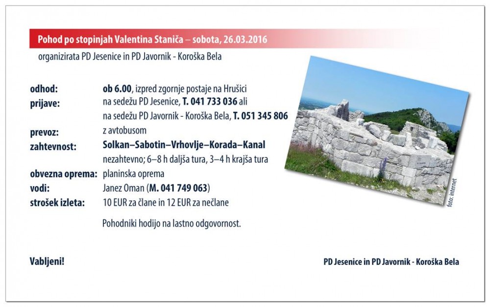 26. 3. 2016 / Izlet, ogledov: 1784Pohod po stopinjah Valentina Staniča | Vrsta dogodka | Izlet | Območje | Notranjska in Primorska | Kdaj | 26. 3. 2016 6:00, zgornja postaja na Hrušici | Organizator | PD Jesenice & PD Javornik - Koroška Bela | Težavnost | Lahka pot |