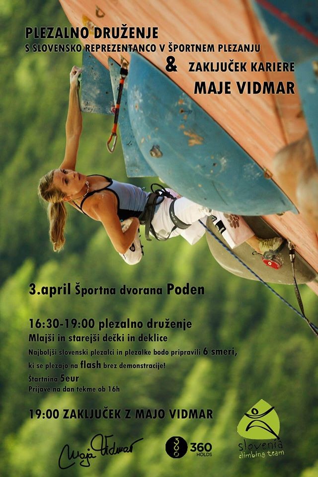 Zaključek kariere Maje Vidmar in plezalno druženje s slovensko reprezentanco v športnem plezanju | Vrsta dogodka | Športno plezanje | Kdaj | 3. 4. 2016 16:30 | Kje | Škofja Loka - športna dvorana Poden | Organizator | Slovenska reprezentanca v športnem plezanju | Povezava | https://www.facebook.com/events/1324310750919199/ | Plezalno druženje s slovensko reprezentanco v športnem plezanju in zaključek kariere Maje Vidmar bo v nedeljo, 3. aprila 2016, v športni dvorani Poden v Škofji Loki.