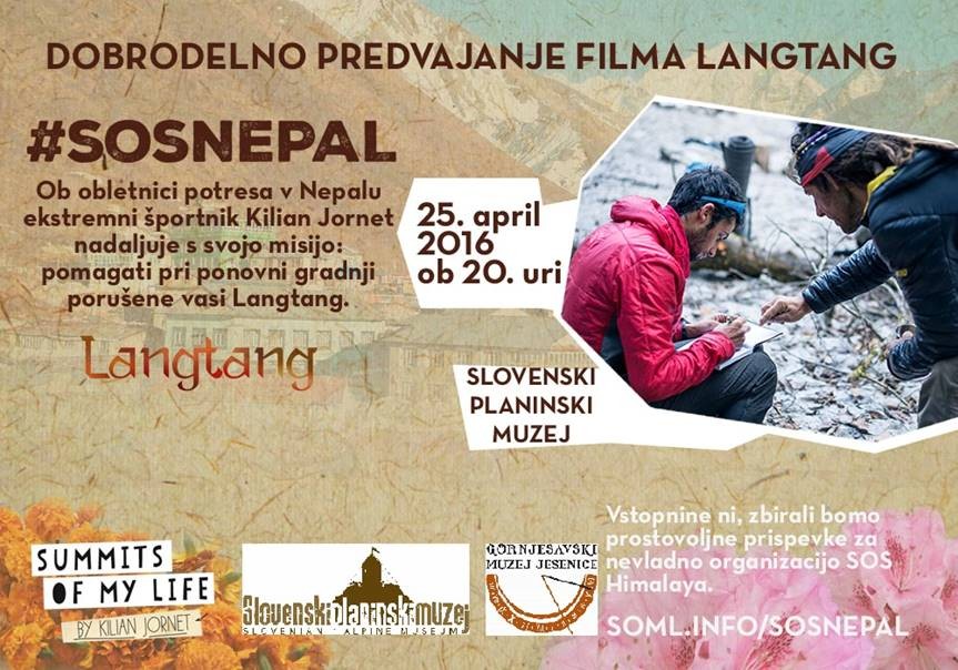 #SOSNEPAL: dobrodelno predvajanje filma Langtang | Vrsta dogodka | Kulturna prireditev | Kdaj | 25. 4. 2016 20:00 | Kje | Slovenski planinski muzej, Mojstrana | Organizator | Slovenski planinski muzej | Povezava | http://www.planinskimuzej.si/?mod=aktualno&action=viewOne&ID=594 | 25. aprila