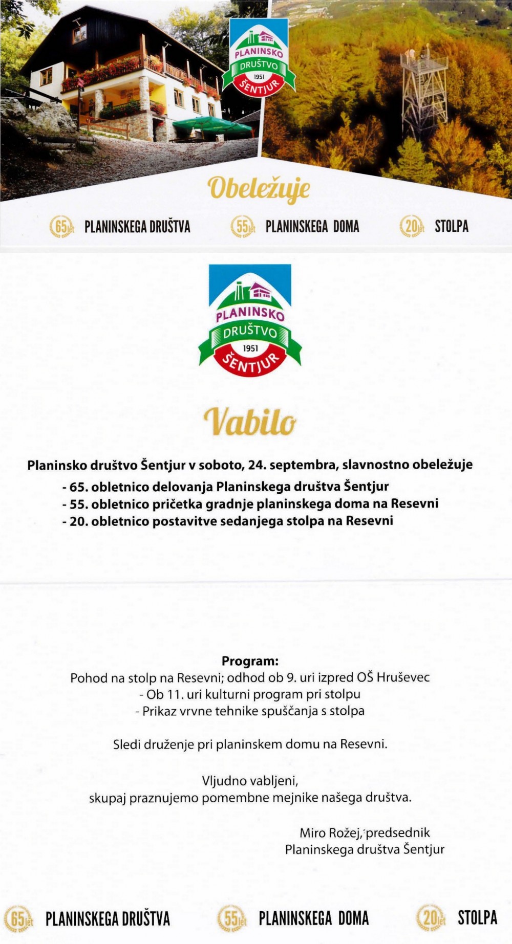 65 let PD Šentjur, 55 let Planinskega doma na Resevni, 20 let stolpa na Resevni Komentarji