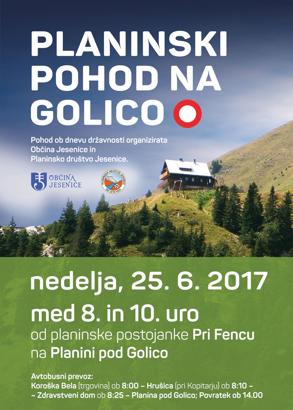 25. 6. 2017 / Pohod, ogledov: 18358. Pohod na Golico v sodelovanju z Občino Jesenice | Vrsta dogodka | Pohod | Območje | Karavanke | Kdaj | 25. 6. 2017 7:00 | Kje | Planina pod Golico - vrh Golice | Društvo | Planinsko društvo Jesenice | Organizator | Planinsko društvo Jesenice, Občina Jesenice | Vodnik / kontakt | 04 58 66 070 | Informacije | Planinsko društvo Jesenice | Težavnost | Lahka pot | Pot | Označena pot | Primernost | Primerno za družine | Višinska razlika | 800 m | Trajanje/dolžina | 2 - 2,5 uri | Način prevoza | Lasten | Cena | 0 € | Oprema / dokumenti | Planinska pohodna oprema |