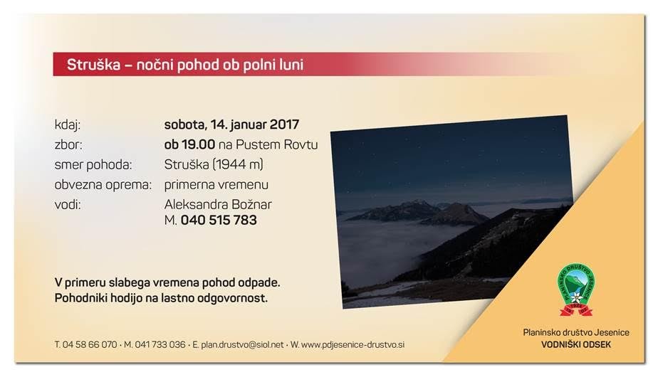 14. 1. 2017, ogledov: 1280Nočni pohod ob polni luni na Struško Komentarji