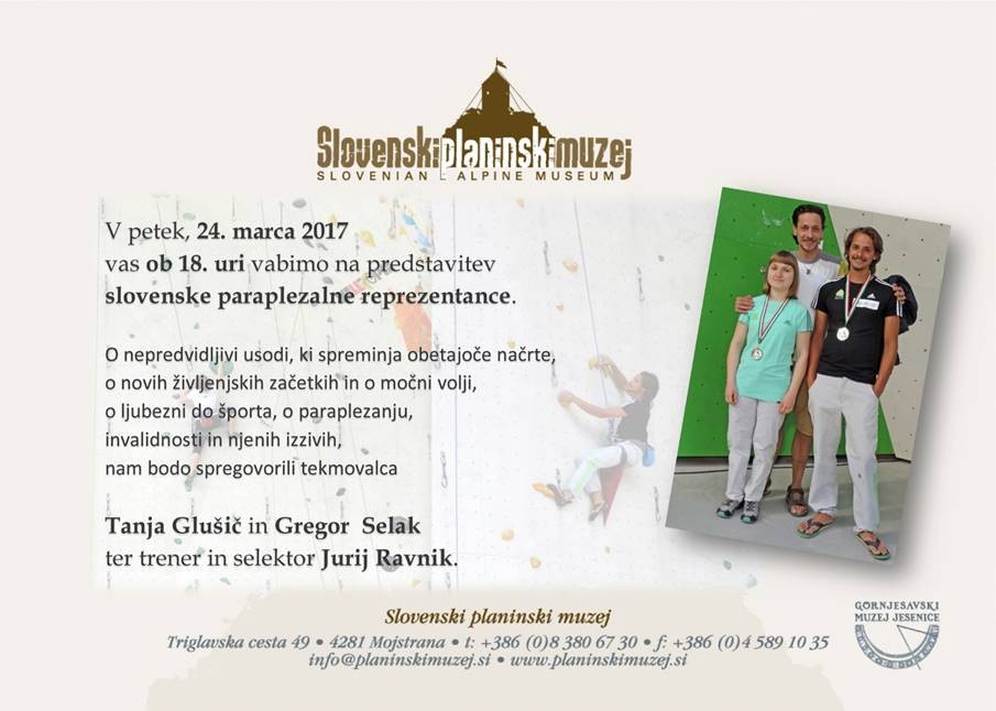 Muzejski večer: Slovenska paraplezalna reprezentanca  | Vrsta dogodka | Predavanje | Kdaj | 24. 3. 2017 18:00 | Kje | Slovenski planinski muzej, Mojstrana | Organizator | Slovenski planinski muzej | Povezava | http://www.planinskimuzej.si/?mod=aktualno&action=viewOne&ID=643 | Slovenska paraplezalna reprezentanca