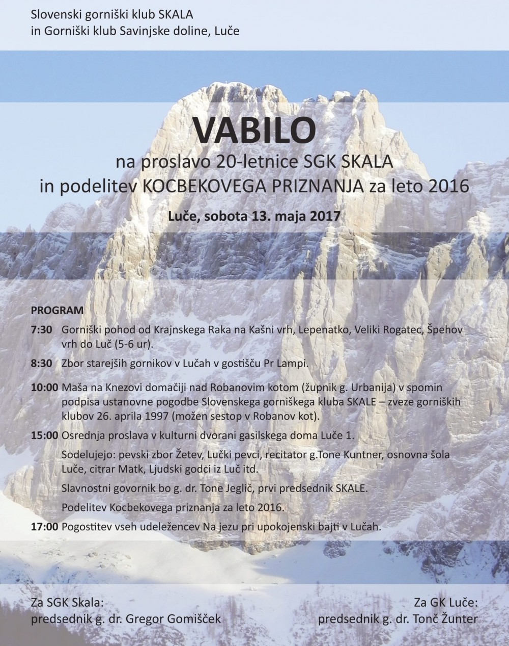 Proslava ob 20-letnici Slovenskega gorniškega kluba Skala | Vrsta dogodka | Kulturna prireditev | Kdaj | 13. 5. 2017 15:00, Luče | Kje | Luče | Organizator | SGK Skala | Iz družbe idealističnih, celo romantičnih in v gore zaljubljenih rosno mladih ljudi, je na Slovenskem v obdobju med obema vojnama nastala močna planinsko-športna in kulturno-vzgojna organizacija - Turistovski klub Skala. Obdobje delovanja Skale velja za eno najbolj vsestransko bogatih v slovenski gorniški zgodovini. Iz vrst skalašev je izšlo mnogo odličnih alpinistov, smučarjev, sankačev, gorskih reševalcev, fotografov, literatov, predavateljev in filmskih ustvarjalcev. Težko je reči, v kateri od teh dejavnosti je Turistovski klub Skala dosegel najlepše rezultate, ker je bilo njegovo delo tako zelo vsestransko in so marsikje prav skalaši morali orati ledino. Lahko pa bi izpostavili alpinistično in smučarsko dejavnost. Živečih članic in članov ni več, njihove zgodbe pa živijo predvsem v njihovem brezčasnem delu, ki je imelo za Slovenijo izreden pomen.