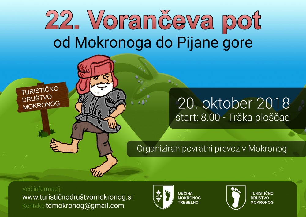 20. 10. 2018 / Pohod, ogledov: 110722. Vorančeva pot | Vrsta dogodka | Pohod | Območje | Posavsko hribovje | Kdaj | 20. 10. 2018 8:00 | Kje | Mokronog | Organizator | TD Mokronog | Primernost | Primerno za družine |  |