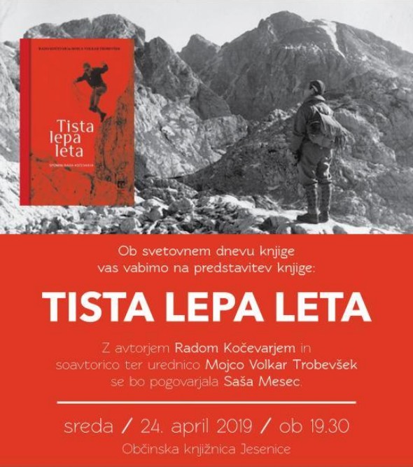 Tista lepa leta: Spomini Rada Kočevarja | Vrsta dogodka | Kulturna prireditev | Kdaj | 24. 4. 2019 19:30 | Kje | Občinska knjižnica Jesenice | Organizator | Občinska knjižnica Jesenice, Slovenski planinski muzej | Povezava | https://www.knjiznica-jesenice.si/news.php |