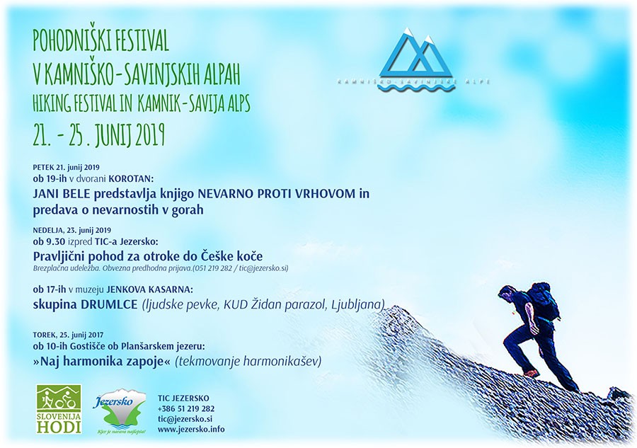 Pohodniški festival: predavanja o nevarnostih v gorah | Vrsta dogodka | Predavanje | Kdaj | 21. 6. 2019 | Kje | Zgornje Jezersko - dvorana Korotan | Komisija | Gorniške vasi | Organizator | Gorniška vas Jezersko | Povezava | https://www.jezersko.si/objava/81615 | V petek, 21. junija, ob 19.00 si rezervirajte čas in se udeležite predavanja o nevarnosti v gorah, skupaj s predstavitvijo knjige Nevarno proti vrhovom.