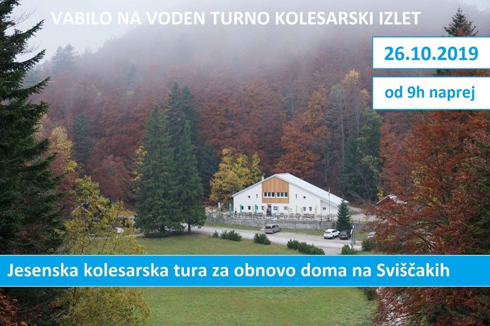 Jesenska kolesarska tura za obnovo doma na Sviščakih | Vrsta dogodka | Turnokolesarska tura | Območje | Notranjska in Primorska | Kdaj | 26. 10. 2019 09:00 | Kje | Sviščaki pri Ilirski Bistrici | Društvo | Planinsko društvo Snežnik Ilirska Bistrica | Komisija | Komisija za turno kolesarstvo | Povezava | https://www.facebook.com/events/1354622244694795/ | Turnokolesarska sekcija PD Snežnik Ilirska Bistrica in BikeBeerFestival vabita v soboto, 26. 10. 2019, na dobrodelni turnokolesarski izlet za obnovo Planinskega doma na Sviščakih. Dobimo se v soboto ob 9.00 pred planinskim domom na Sviščakih, ki nas bo pozdravil v novi, težko pričakovani osveženi zunanji podobi.