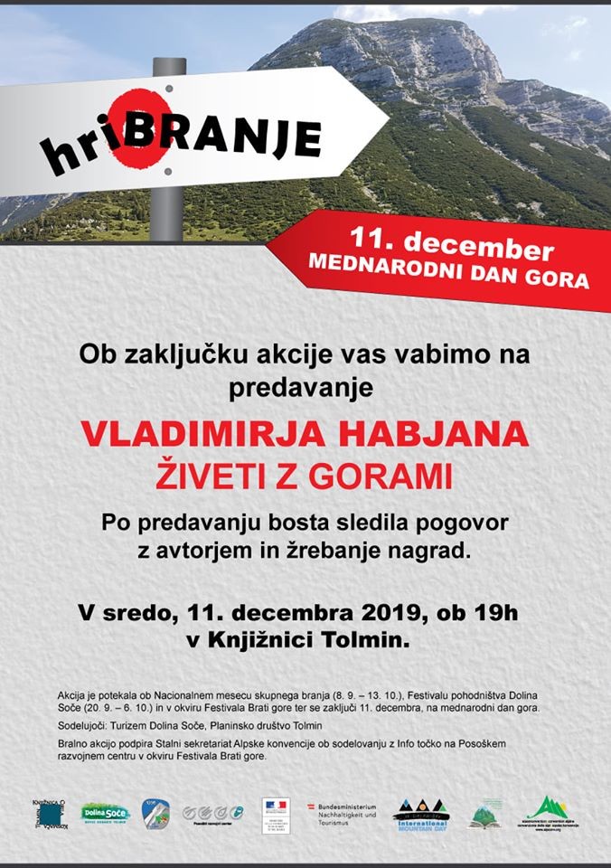 Zaključek akcije hriBRANJE z Vladimirjem Habjanom: Živeti z gorami | Vrsta dogodka | Kulturna prireditev | Kdaj | 11. 12. 2019 19:00 | Kje | Knjižnica Cirila Kosmača Tolmin | Društvo | Planinsko društvo Tolmin | Organizator | Knjižnica Cirila Kosmača Tolmin in Posoški razvojni center | Povezava | https://www.kcktolmin.si/akcija-hribranje-2019/ | V Knjižnici Cirila Kosmača Tolmin ob Nacionalnem mesecu skupnega branja, Festivalu pohodništva Dolina Soče in Festivalu Brati gore tudi letos poteka akcija hriBRANJE, in sicer od 4. oktobra, ko je bilo v Knjižnici Tolmin predavanje alpinista Aleša Česna, do 11. decembra, ko obeležujemo mednarodni dan gora.