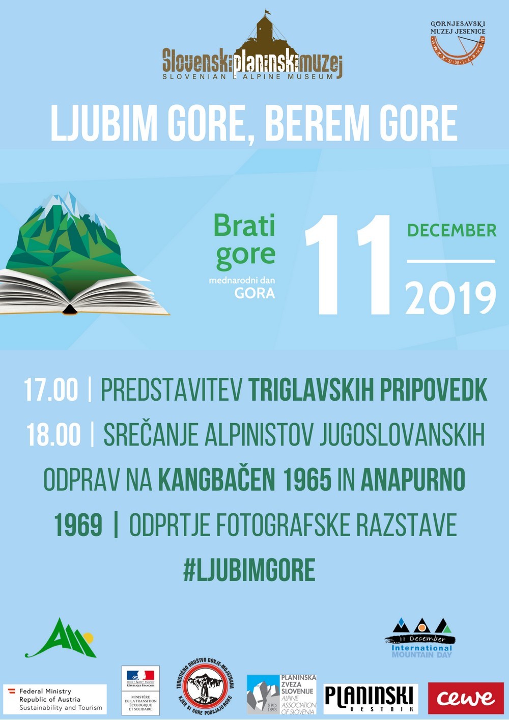 Ljubim gore, berem gore 2019 | Vrsta dogodka | Kulturna prireditev | Kdaj | 11. 12. 2019 17:00 | Kje | Slovenski planinski muzej, Mojstrana | Komisija | Komisija za alpinizem | Povezava | http://www.planinskimuzej.si/ljubim-gore-berem-gore-2019/ | 11. december 2019 | 17.00