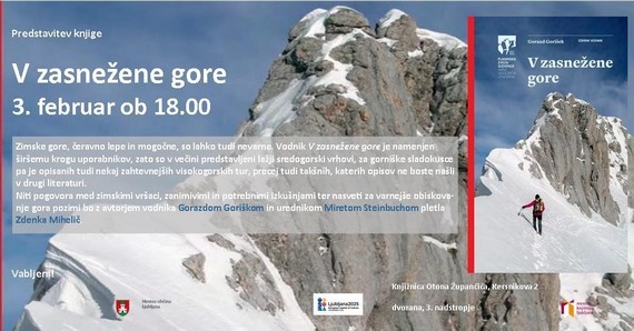 Predstavitev vodnika V zasnežene gore | Vrsta dogodka | Predavanje | Kdaj | 3. 2. 2020 18:00, Knjižnica Otona Župančiča Ljubljana | Kje | Ljubljana | Komisija | Odbor za založništvo in informiranje | Vabimo vas na pogovor in predstavitev vodnika