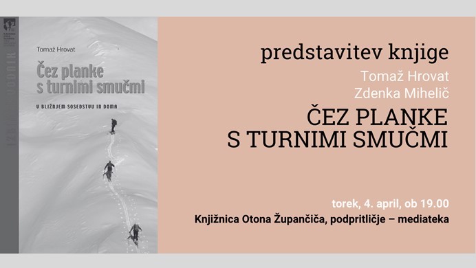 Predstavitev knjige Čez planke s turnimi smučmi (Tomaž Hrovat) | Vrsta dogodka | Kulturna prireditev | Kdaj | 4. 4. 2023 | Kje | Ljubljana | Komisija | Odbor za založništvo in informiranje | Organizator | Knjižnica Otona Župančiča Ljubljana | Čez planke s turnimi smučmi Nov izbirni planinski vodnik Planinske založbe PZS Čez planke s turnimi smučmiavtorja Tomaža Hrovata prebuja željo po odkrivanju novih belih prostranstev v naši bližnji okolici čez mejo, kjer se odpira mnogo novih možnosti za vse izkušene turne smučarje, ki si želijo bele nedotaknjene strmine okušati še drugod. O veselju na turnih smučeh, potrebnem znanju, novih vrhovih in ciljih, najljubših kotičkih in željah se bo z avtorjem vodnika Tomažem Hrovatom pogovarjala Zdenka Mihelič. Kje?