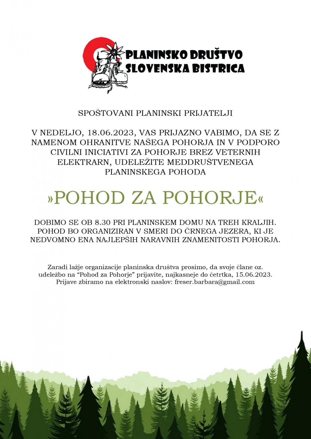 18. 6. 2023 / Pohod, ogledov: 809Pohod za Pohorje | Vrsta dogodka | Pohod | Območje | Gričevja in hribovja severovzhodne Slovenije | Kdaj | 18. 6. 2023 | Društvo | Planinsko društvo Slovenska Bistrica | MDO PD | MDO PD Podravja | Komisija | Komisija za varstvo gorske narave | Projekt vetrni park Slovenska Bistrica predvideva postavitev 56 vetrnih elektrarn na pobočjih Pohorja in vključuje še gradnjo kablovoda od posamezne elektrarne do priklopa na transformatorski postaji ter gradnjo dostopnih poti do vsake elektrarne. Naše planinsko društvo (PD Slovenska Bistrica) organizira meddruštveni planinski izlet "Pohod za Pohorje". Z gesto podpore lahko skupaj pomagamo k ohranitvi narave. Častni kodeks slovenskih planincev v poglavju III. VARSTVO NARAVE IN OKOLJA med drugim pravi: Naravna bogastva in lepote so vir, iz katerega črpa planinstvo svojo moč in poslanstvo. Varovanje narave je v najširšem družbenem interesu, planinstvo pa je z naravo tesno povezano, zato dosledno spoštujemo prvine varstva narave in okolja, pri čemer izhajamo iz dejstva, da smo v naravi vedno samo njeni varuhi in učeči se ter opazujoči gostje. V tem prizadevanju smo planinci zgled tudi drugim. Prisrčno vabimo planinska društva, pridite k nam na Pohorje in podprite ohranitev narave. Ker želimo poskrbeti, da bo planinski pohod potekal varno, vljudno naprošam vsa društva za prisotnost vodnikov kot pomoč pri vodenju.