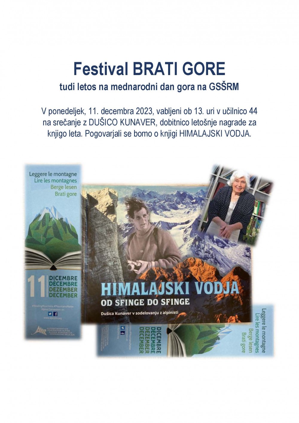 Brati gore | Dušica Kunaver: Himalajski vodja | Vrsta dogodka | Kulturna prireditev | Kdaj | 11. 12. 2023 13:00 | Kje | Gimnazija in srednja šola Rudolfa Maistra Kamnik | Organizator | Gimnazija in srednja šola Rudolfa Maistra Kamnik |