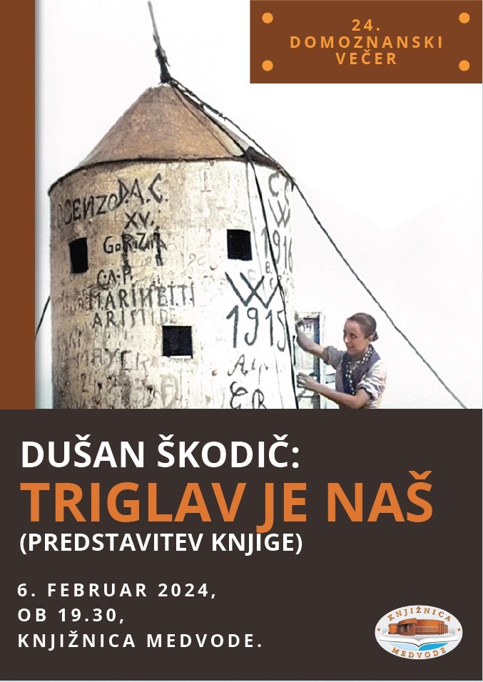 Predstavitev knjige Triglav je naš | Medvode | Vrsta dogodka | Kulturna prireditev | Kdaj | 6. 2. 2024 | Kje | Knjižnica Medvode | Društvo | Planinsko društvo Medvode | Organizator | Knjižnica Medvode | Povezava | https://www.knjiznica-medvode.si/dogodki/predstavitev-knjige-triglav-je-nas-dusan-skodic/ | Vabljeni na predstavitev knjige Triglav je naš, domačina Dušana Škodiča. Knjiga Triglav je naš osvetljuje začetke organiziranega planinstva in alpinizma na Slovenskem. Gre za obdobje, v katerem so slovenske gore zaznamovali najprej posamezniki, od druge polovice 19. stoletja pa zlasti Nemško in Avstrijsko planinsko društvo, ki je v našem prostoru pustilo globoke sledi, tudi v povezavi s Slovenskim planinskim društvom. Razvoj organiziranega planinstva in alpinizma v Avstroogrski monarhiji je bil prepleten s prebujanjem narodne zavesti, ki je trčila ob hotenja tukaj živečih Nemcev, ki so te gore prav tako imeli za svoje. |