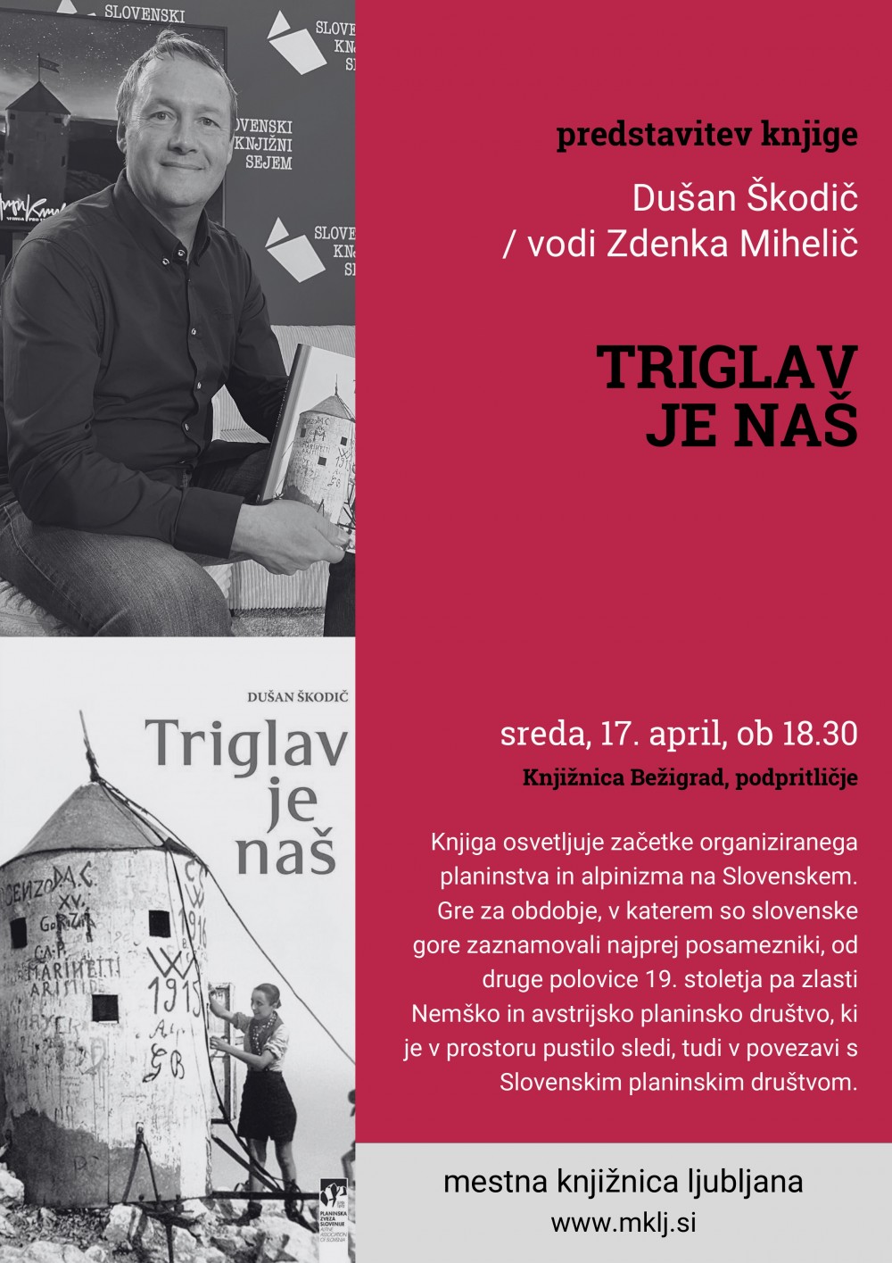 Dušan Škodič: Triglav je naš | Knjižnica Bežigrad | Vrsta dogodka | Kulturna prireditev | Kdaj | 17. 4. 2024 18:30 | Kje | Knjižnica Bežigrad - Ljubljana | Organizator | Mestna knjižnica Ljubljana | Povezava | https://www.mklj.si/dogodek/triglav-je-nas-dusan-skodic/ | Knjiga Dušana Škodiča Triglav je naš osvetljuje začetke organiziranega planinstva in alpinizma na Slovenskem. Gre za obdobje, v katerem so slovenske gore zaznamovali najprej posamezniki, od druge polovice 19. stoletja pa zlasti Nemško in avstrijsko planinsko društvo (DÖAV), ki je v našem prostoru pustilo globoke sledi, tudi v povezavi s Slovenskim planinskim društvom (SPD). Razvoj organiziranega planinstva in alpinizma v Avstroogrski monarhiji je bil prepleten s prebujanjem narodne zavesti, ki je trčila ob hotenja tukaj živečih Nemcev, ki so te gore prav tako imeli za svoje.