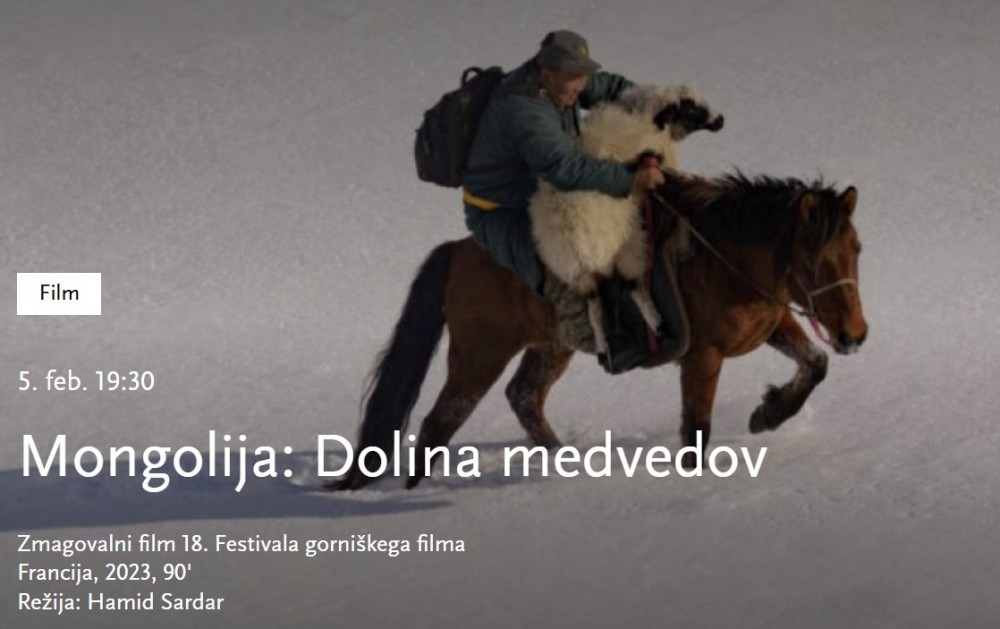 Mongolija: Dolina medvedov | zmagovalni film 18. FGF | Vrsta dogodka | Kulturna prireditev | Kdaj | 5. 2. 2025 19:30 | Kje | Cankarjev dom - Ljubljana | Organizator | Festival gorniškega filma | Povezava | https://www.cd-cc.si/kultura/film/mongolija-dolina-medvedov | Mongolija: Dolina medvedov Zmagovalni film 18. Festivala gorniškega filma Francija, 2023, 90' Režija: Hamid Sardar