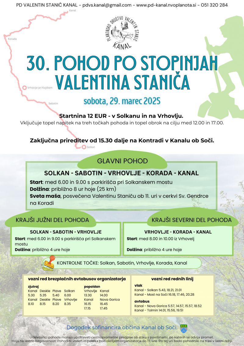 29. 3. 2025 / Pohod, ogledov: 603Tradicionalni 30.pohod Po stopinjah Valentina Staniča | Vrsta dogodka | Pohod | Območje | Notranjska in Primorska | Kdaj | 29. 3. 2025 6:00 | Kje | Solkan-Sabotin-Vrhovlje-Korada-Kanal | Društvo | Planinsko društvo Valentin Stanič Kanal | Organizator | Planinsko društvo Valentin Stanič Kanal | Vodnik / kontakt | pohod ni voden | Prijave | Prijavnina 12 eur v Solkanu oziroma na Vrhovlju | Informacije | Tel.:051 320 284 ,e-mail:pdvs.kanal@gmail.com ,http://www.pd-kanal.nvoplanota.si | Težavnost | Lahka | Pot | Označena pot | Primernost | Za vse z primerno kondicijo Primerno za družine | Višinska razlika | cca.:1000m | Trajanje/dolžina | 8 ur hoje oz.25km | Način prevoza | Avtobus organizatorja in javni prevoz | Cena | Prijavnina 12 eur | Oprema / dokumenti | Priporoča se pohodne palice in pohodniške čevlje | Tradicionalni 30.pohod posvečen duhovniku,gorniku,humanistu Valentinu Staniču se začne v Solkanu kjer se vzpnemo na Sabotin ter po grebenu nad prelepo smaragdno Sočo prispemo na Vrhovlje kjer nadaljujemo do Korade ter se spustimo v Kanal kjer je na trgu Kontrada zaključna prireditev. Pohod je vsako leto dobro obiskan saj ponuja prelepe razglede od morja do Dolomitov,Karnijskih Alp ter Julijskih Alp. Vabljeni! |