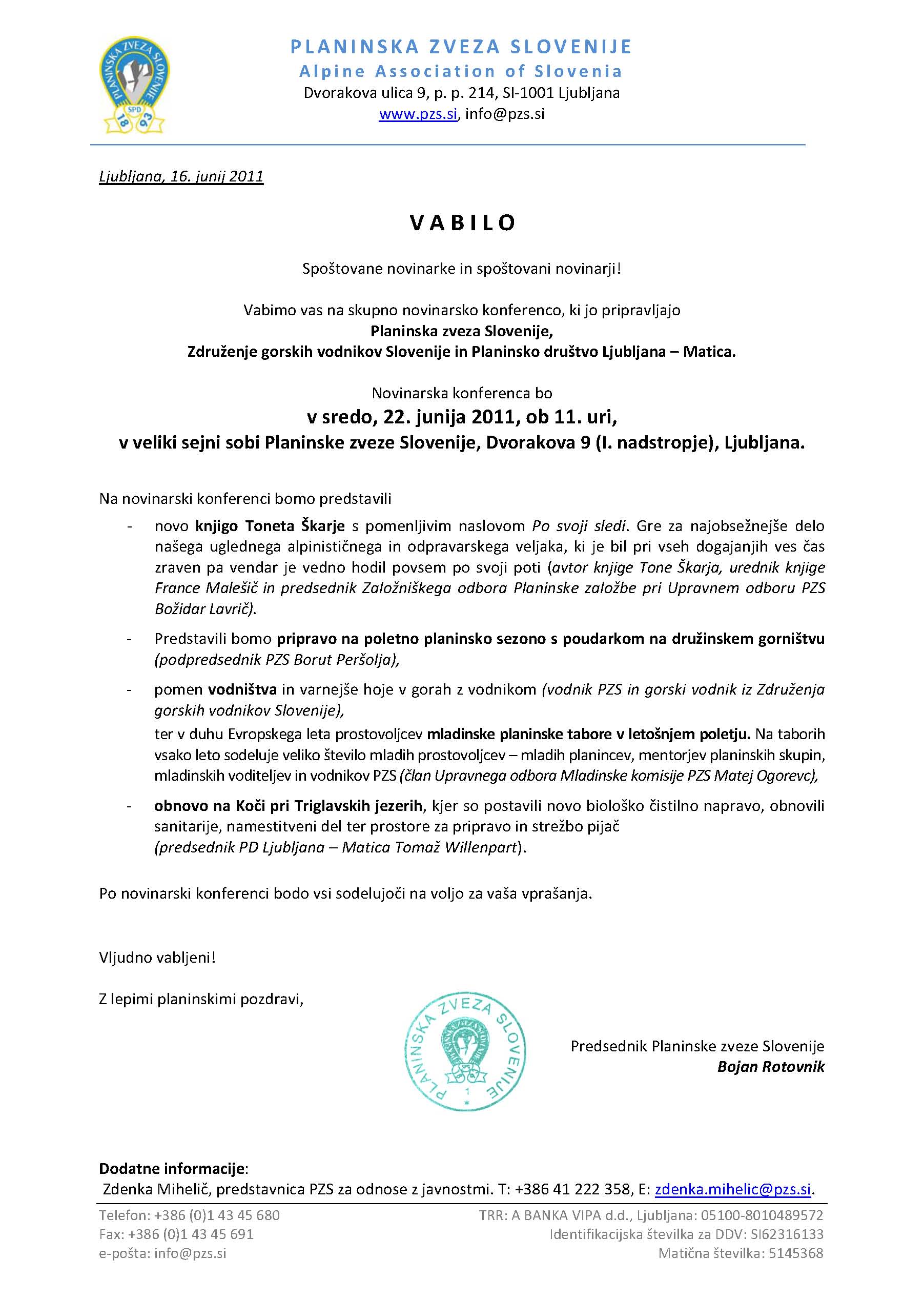 Vabimo vas na skupno novinarsko konferenco, ki jo pripravljamo Planinska zveza Slovenije, Združenje gorskih vodnikov Slovenije in Planinsko društvo Ljubljana - Matica.