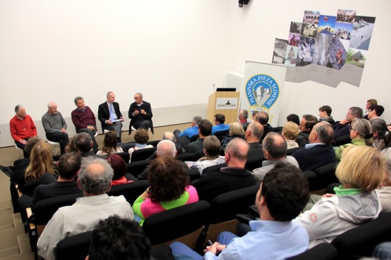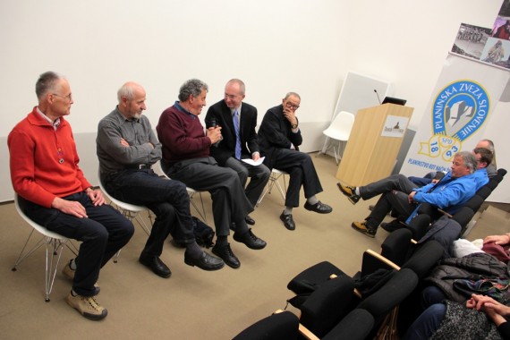 France Malešič, Danilo Cedilnik - Den, Tomaž Banovec, Marjan Bradeško in Stanko Klinar so ob 120. obletnici osvetlili vlogo in pomen Planinskega vestnika, najstarejše še izhajajoče slovenske revije. (foto Manca Čujež)