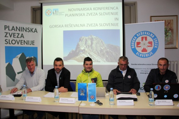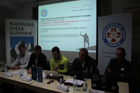 Janko Rabič, Matej Planko, Matjaž Šerkezi, Igor Potočnik in Klemen Volontar na novinarski konferenci PZS in GRZS pred začetkom zimske planinske sezone (foto Manca Čujež)