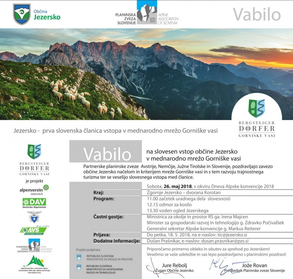 Partnerske planinske zveze Avstrije, Nemčije, Južne Tirolske in Slovenije pozdravljajo zavezo občine Jezersko načelom in kriterijem mreže Gorniške vasi in s tem razvoju trajnostnega turizma ter se veselijo slovesnega vstopa med članice, ki bo v soboto, 26. maja, v okviru Dneva Alpske konvencije 2018, v dvorani Korotan na Zgornjem Jezerskem.