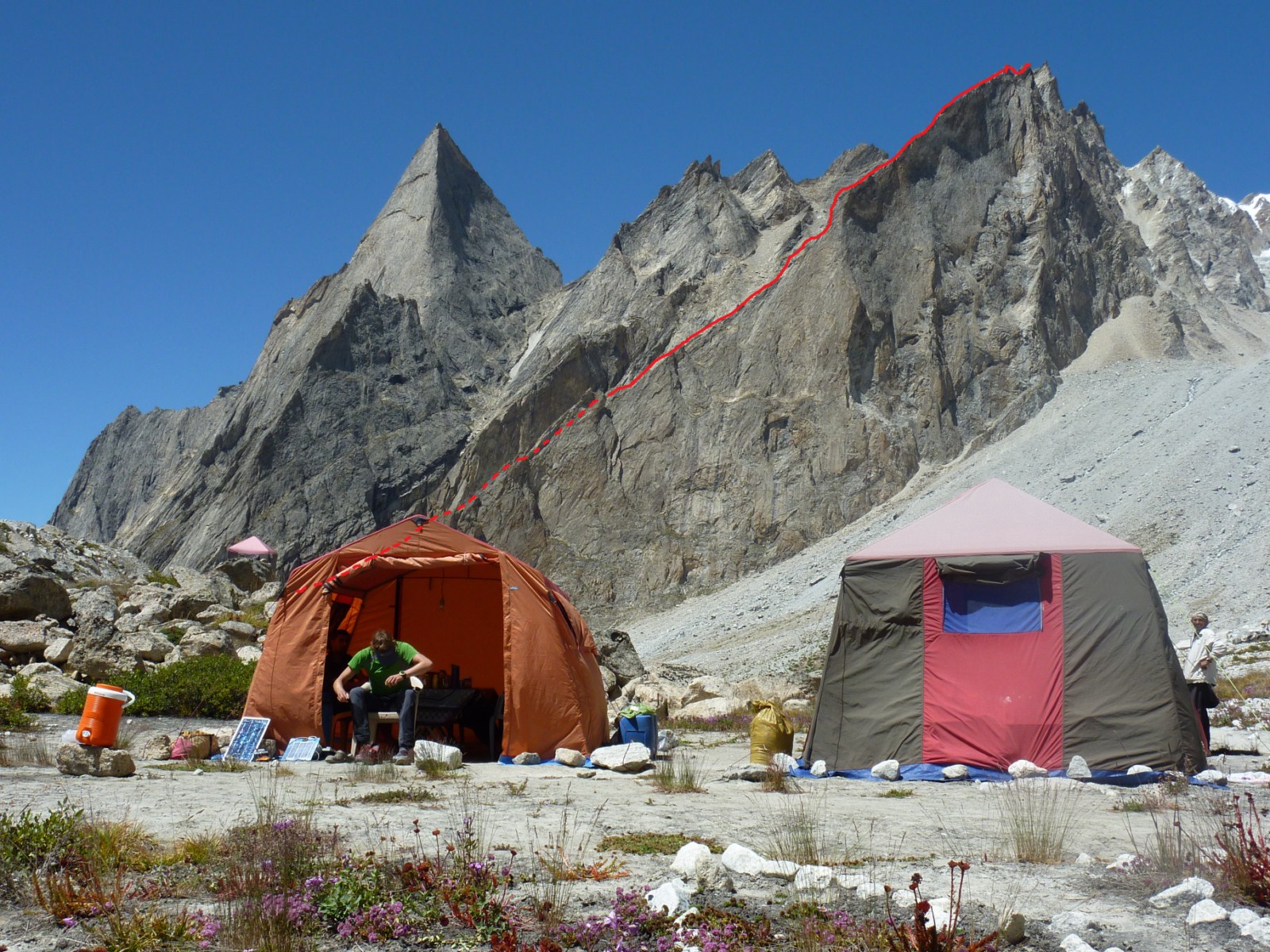 Foto arhiv alpinistične odprave Charakusa 2011: Fotografija K7 West z vrisano smerjo Sanjači zlatih jam v visoki resoluciji (862 KB, 1500 x 2000)